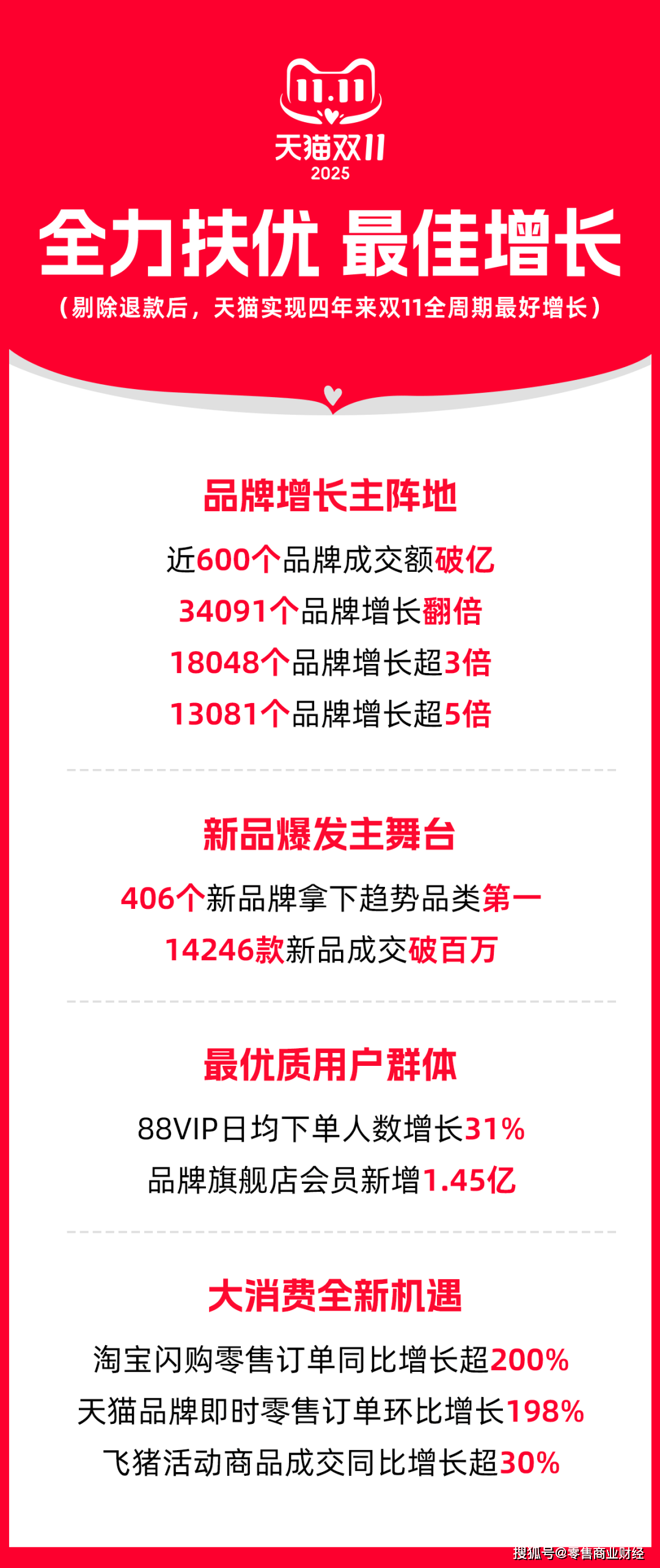 11月17日动静,盒马创始人侯毅透露,因线下门店运营压力大,打算到本年12月中旬封闭所有“派特鲜生”门店,但会保留线日,淘天发布本年“双11”和报。数据显示,近600个品牌成交破亿,34091个品牌同比客岁增加翻倍,18048个同比增加超3倍,13081个同比增加超5倍,均超客岁同期。此中,苹果、海尔、美的、源氏木语、小米等品牌成交破10亿。立即零售方面,“双11”淘宝闪购零售订单同比客岁增加超2倍,天猫品牌立即零售日均订单环比9月增加了198%。天猫总裁家洛暗示:“正在搀扶优良品牌和原创商家的计谋带动下,同时得益于平台史上力度最大的消费者投资,天猫实现了四年以来双11全周期最好的一次增加(剔除退款后成交)。”?。