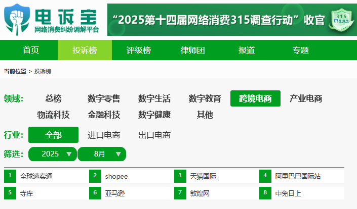 正在此布景下,9月3日,根据国内出名收集消费胶葛调整平台“电诉宝”(8月所受理的全国互联网消费平台胶葛大量案例数据,阐发2025年8月电商平台用户赞扬数据,例行发布《2025年8月中国电子商务用户体验取赞扬数据演讲》以窥见当前电商平台消费者窘境。(详见专题:)8月,入选跨境电商用户赞扬赞扬量TOP8顺次为:全球速卖通、shopee、天猫国际、阿里巴巴国际坐、当铺、敦煌网、中免日上。