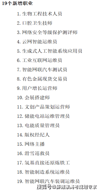 智能制制工程手艺人员、工业互联网工程手艺人员、集成电工程手艺人员、企业合规师、公司金融参谋、易货师、二手车经纪人、汽车救援员、调饮师、食物平安办理师、办事机械人使用手艺员、电子数据取证阐发师、职业培训师、暗码手艺使用员、建建幕墙设想师、碳排放办理员、管廊运维员、酒体设想师、智能硬件拆调员、工业视觉系统运维员、社群健康帮理员、健康照护师、孤残儿童护理员、老年人能力评估师等。